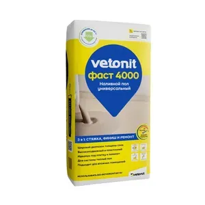 Vetonit Фаст 4000 - самовыравнивающийся универсальный быстротвердеющий наливной пол. 3 в 1: стяжка, финиш + ремонт благодаря широкому диапазону толщин (3-80 мм). Применяется как в сухих, так и во влажных помещениях под укладку ламината, плитки, линолеума, ковролина и тп. Применим для системы «теплый пол» с электроподогревом. В зависимости от типа напольного покрытия и толщины слоя его укладка возможна от 1 дня. Ходить по полу разрешается уже через 4 часа. Продукт обладает оптимальным расходом, высокой растекамостью и удобен в работе.